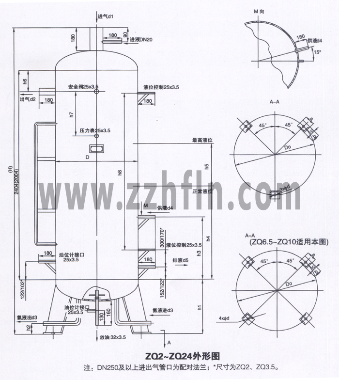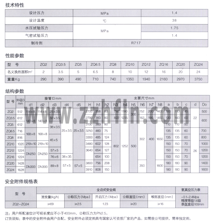 ZQ系列中間冷卻器用于一級(jí)節(jié)流中間完全冷卻系統(tǒng)。貯液器來(lái)的高壓氨液分兩路進(jìn)入中間冷卻:一路進(jìn)入盤(pán)管內(nèi)過(guò)冷后供給系統(tǒng)制冷,另一路經(jīng)節(jié)流閥節(jié)流后進(jìn)入冷卻器的殼體內(nèi)蒸發(fā)、吸收管內(nèi)高壓氨液的熱量,并對(duì)低壓級(jí)的排氣進(jìn)行洗滌降溫后,同低壓級(jí)排氣一同被高壓級(jí)吸走。