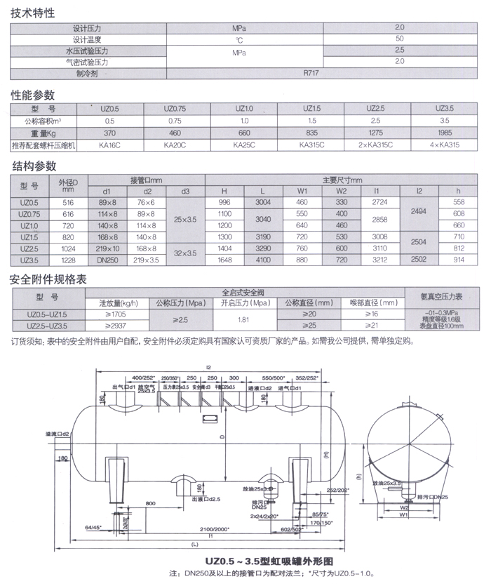 UZ系列虹吸罐主要用于液冷油冷螺桿壓縮機制冷系統,用以保證冷凝器冷凝后的液體優先供給油冷卻器。