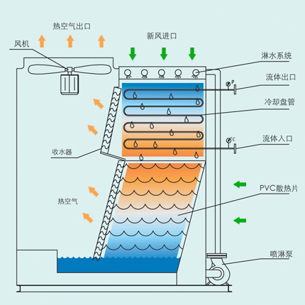 工作流體(水,油或其他液體)在換熱盤管中流動,盤管外壁被噴淋水包裹,流體的熱量通過管壁傳遞,與水和空氣行成飽和濕熱蒸氣,熱量由風機排入大氣。噴淋水在循環的過程中通過PVC填料降低溫度。從上到下,在盤管部位,噴淋水與進塔新風形成風水同向流動,而在填料段,噴淋水與進塔新風橫向流動。故得名混流式閉式冷卻塔。